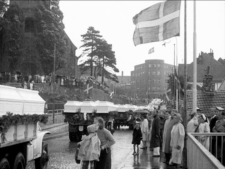 Der findes også imponerende og bevægende optagelser fra den store mindehøjtidelighed, som blev afholdt for de faldne den 29. august 1945. Blandt andet den enorme bilkortege med flagdækkede kister af krigens faldne, som heller ikke fandt plads i filmene. Det samme gælder optagelserne af det sørgetog med 115 kister med danskere, der døde i tysk fangenskab, som blev kørt i procession op gennem Danmark ’på et tæppe af blomster’, som skolebørn har kastet ud foran ’Danmarks største ligtog’, som speaken forkynder. Det kom der en ugerevy fra Dansk Film Co. ud af, 'Danske Patrioters Hjemførsel fra Tyskland', men ingen klip i de vigtigste film om besættelsen.