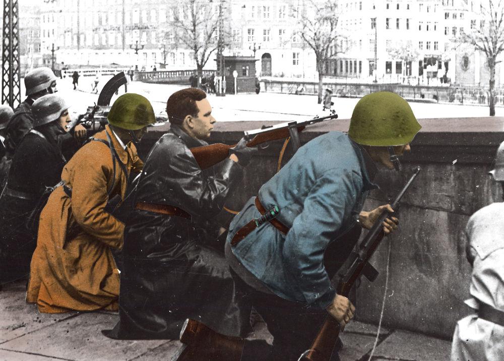 Henover sommeren 1945 løb de første befrielsesfilm og ugerevyer over lærredet; der var i første omgang tale om mindre, lokale produktioner med titler som eksempelvis Sol over Roskilde, der havde den lokale fotohandler som producent, og viste, hvordan befrielsen spændte af på de kanter. Også københavnske filmproducenter gjorde sig gældende. Saga havde haft et kamerahold på farten i befrielsesdagene og optog, da danske frihedskæmpere d. 15. maj nedkæmpede tyske søfolk, som havde forskanset sig på tyske krigsskibe ved B&W på Refshaleøen. Filmen 'Frihedskæmpere besætter B&W' har format som et ugerevyindslag og viser i tydeligt iscenesatte sekvenser, hvordan de tyske soldater besejres. Modstandsfolkene stormer frem og skyder løs på filmens lydside, uden at maskingeværerne på billedsiden hverken slår tilbage i rekyl eller afgiver krudtrøg, de kryber i ly for kugler, der ikke flyver fra modstandernes usete våben, og hejser naturligvis Dannebrog over værftet i sejrens stund. En såret tysker fanger kameraet også, så der er altså rent faktisk blevet skudt med skarpt, hvad man godt kan blive i tvivl om, når man ser filmen. Alt er nydeligt optaget og klippet, ikke et rystende kamera eller uskarpt og underbelyst billede. Kampen imod tyskerne blev noget nemmere at få på film efter besættelsen.